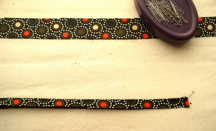 Полоску для будущей бейки вырезаю под углом 45 градусов к основной нити. Ширина — 3 см.